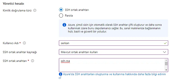 Sanal makinemizin kullanıcı adını belirleyelim ve kopyaladığımız SSH anahtarını ilgili alana yapıştıralım.