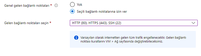 Azure’da sanal makine oluştururken karşımıza çıkan Gelen Bağlantı Noktaları ayarı, sanal makinemizin hangi ağ bağlantı noktalarından genel internet üzerinden erişilebileceğini belirlememize olanak tanır. Bu ayarı özelleştirirken, işlevselliğinizi ve güvenliğinizi ihtiyacınıza uygun şekilde yapılandırabilirsiniz.
